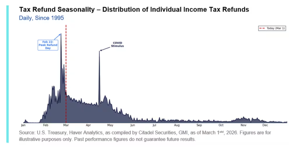 Rubner 表示,退税资金历史上往往会流入股票等风险资产。退税发放通常在 2 月下旬开始加速,而由于特朗普总统的减税政策,今年预计发放总额会异常庞大。