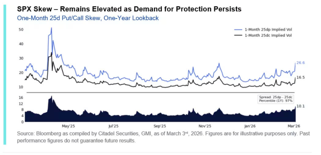 FX168财经报社(亚太)讯 美国股市已经开始收复本周早些时候的跌幅。许多投资者担心,与伊朗持续的冲突可能会在金融市场引发更大的波动。数据显示,对看跌期权的需求正在上升——这种期权可为股票组合提供短期下行保护。