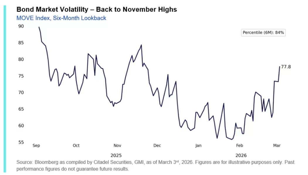 大幅波动的不只是美股。债券、原油等资产的波动指标也在抬升。其中一个指标是 ICE BofA 的 MOVE 指数(衡量美债隐含波动率),它已触及自去年年末以来的最高水平。