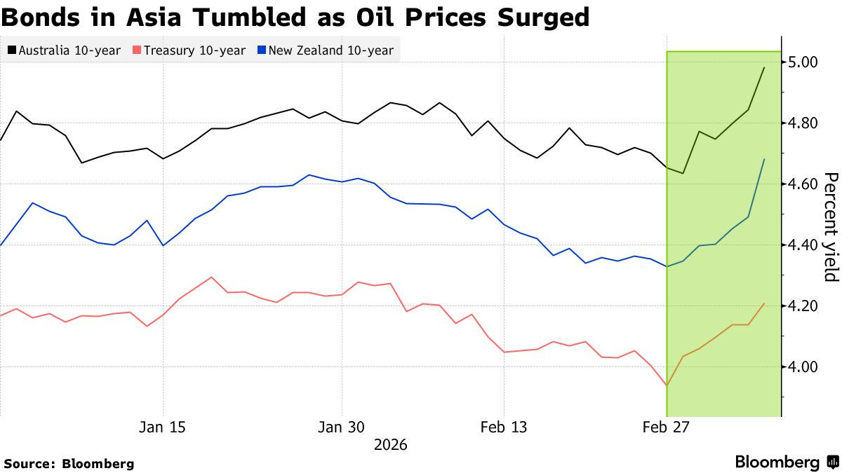 FX168财经报社(亚太)讯 周一(3月9日)亚洲交易时段,全球债券市场大跌。油价冲击促使投资者开始计入更高通胀以及经济增长前景恶化的风险。