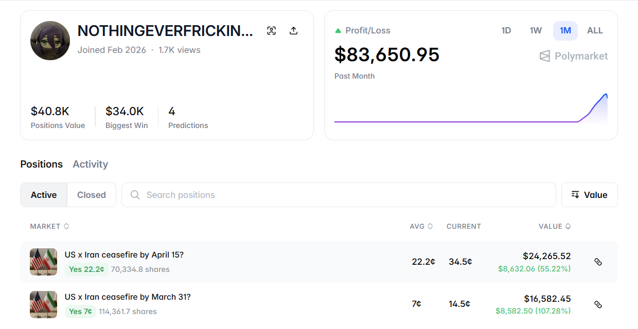 如今,这个账户又押注 8,005 美元,赌美伊将在 3 月 31 日前停火;另外又投入 15,614 美元,赌双方会在 4 月 15 日前停火。这两笔赌注目前已经增值超过 3 万美元。