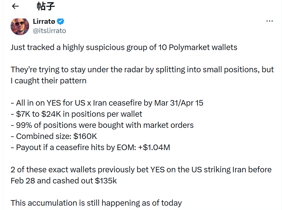 一组最近新开的 10 个账户在 Polymarket 的“美伊停火”市场上投入数千美元,押注停火将在 3 月 31 日或 4 月 15 日之前实现。这些账户合计押注约 16 万美元;如果停火在本月底前实现,它们有望获利超过 100 万美元。