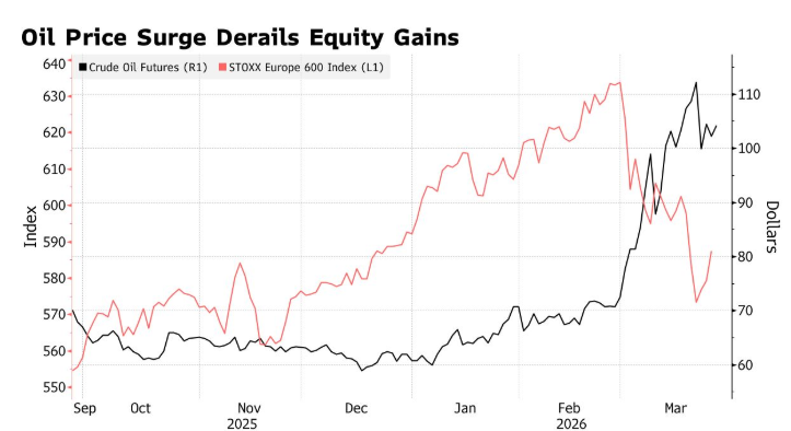 欧洲方面,斯托克600指数下跌 1.3%,至 579.60 点,势将结束此前连续三天的上涨走势。由于霍尔木兹海峡仍处于关闭状态,欧洲尤其容易受到原油价格飙升的冲击,进而加剧通胀和增长担忧。自对伊朗战争爆发以来,STOXX 指数已下跌超过 8%,并正接近确认进入技术性回调。