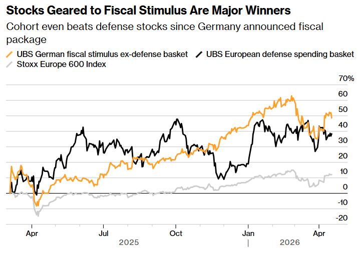 瑞银集团一篮子追踪受益于政府投资上升、但不属于国防类的股票,自德国刺激计划于2025年3月成形以来已上涨近50%。与此同时,欧盟在绿色能源和关键基础设施上的投资,推动高盛集团(Goldman Sachs Group Inc.)的一篮子可再生能源股票上涨约75%。