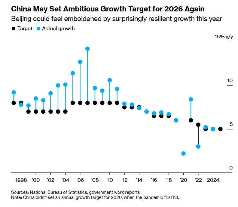 根据彭博整理的13家银行和研究机构预测,其中10家预计政府将在会议中支持为2026年设定约5%的增长目标,与今年相同,但这一目标将在明年3月的全国两会上正式公布。