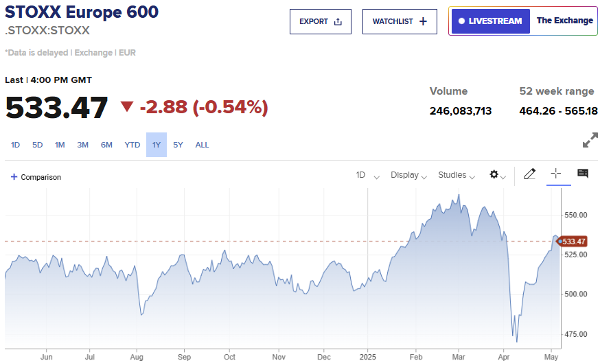 泛欧斯托克600指数(STOXX 600)收跌0.54%, 其他欧洲主要股指亦悉数收跌。
