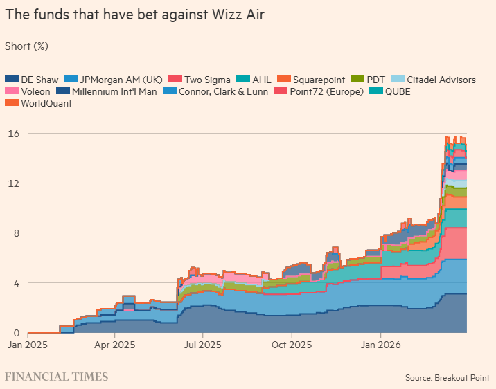 从个股来看,伦敦上市的廉价航空公司Wizz Air上月已成为欧洲被做空最多的股票。此前,该公司警告称,伊朗战争带来的航班扰乱以及燃油成本飙升,将导致其今年利润被大幅侵蚀。