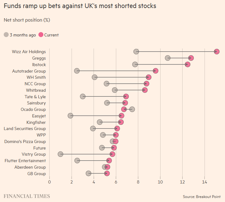 自战争爆发以来,Wizz Air的空头仓位占比已接近翻倍,升至15%;同期其股价累计下跌超过四分之一。其竞争对手easyJet也同样成为空头重点狙击的对象。