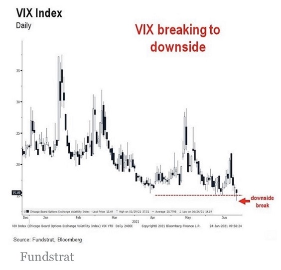 Tom Lee表示,鉴于高收益债券历来是股市的领先指标,垃圾债券发行量在上周四创下纪录高位,这为近期股市涨势提供了可信度。Tom Lee认为,垃圾债券发行量上涨是有正当理由的,包括更强劲的经济和稳定的利率。与此同时,芝加哥期权交易所波动率指数(VIX恐慌指数)上周五跌破16,为新冠大流行以来的最低水平。