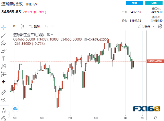 道琼斯指数收盘上涨261.91点,至34869.63点,涨幅0.76%。标准普尔500指数收盘上涨0.23%,报4468.73点。两大股指在过去六个交易日中首次双双收高。纳斯达克综合指数下跌0.07%,报15105.58点,为连续第四天下跌。