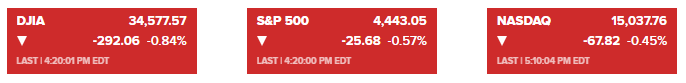 道琼斯指数收盘下跌292.06点,至34577.57点,跌幅0.84%;标准普尔500指数下跌25.68点,或0.57%,报4443.05点;纳斯达克综合指数下跌67.82点,至15037.76点,跌幅0.45%。