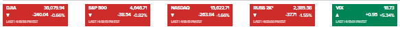 道琼斯指数收盘下跌240.04点,收于36079.94点,跌幅0.66%。标准普尔500指数下跌0.82%,至4646.71点。以科技股为主的纳斯达克综合指数下跌1.66%,报15662.71点。