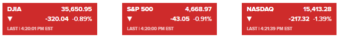 标准普尔500指数收盘下跌0.91%,至4,668.97点,较盘中高点下跌1.6%左右。受波音公司股价下跌3.7%的拖累,道琼斯指数下跌320点或0.89%,至35,650.95点。以科技股为主的纳斯达克综合指数下跌1.39%,至15,413.28点。