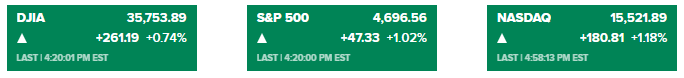 道琼斯指数收盘上涨261.19点,至35753.89点,涨幅0.7%,两天上涨了逾800点。标准普尔500指数上涨1%,至4696.56点,本周有望上涨。纳斯达克综合指数上涨约1.2%,至15521.89点。假期前的交易相对清淡。