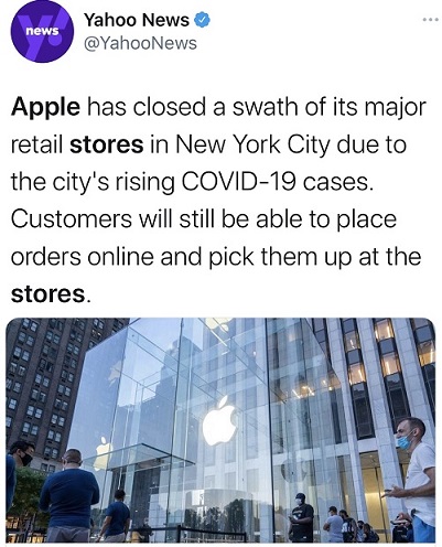 FX168财经报社(香港)讯 由于纽约市新冠肺炎病例的增加,苹果公司周一(12月27日)决定关闭纽约市的所有门店,包括第五大道、中央车站等地的旗舰店。但该公司网站周一表示,那些在网上订购的人可以在实体店外购买商品。