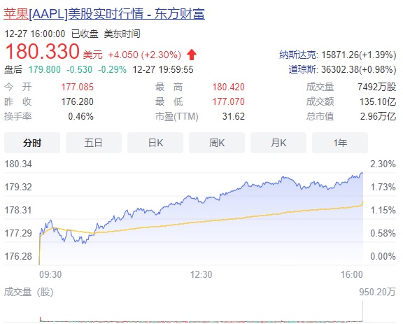 截至12月28日收盘,苹果股价收盘上涨2.3%,刷新收盘历史高位至180.33美元,市值增加664亿美元。苹果公司最新总市值2.96万亿美元。