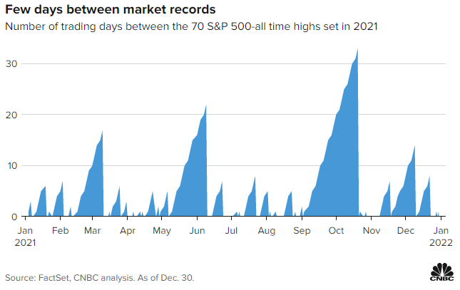 美股频繁刷新收盘纪录。自2020年11月以来,标准普尔500指数每个月至少刷新一次纪录。从9月2日到10月21日的33个交易日中,美股没有创历史新高,为今年以来持续时间最长的一次。