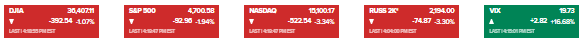 道琼斯指数盘中触及高点后走低,收盘下跌392.54点或1.07%,报36,407.11点。标准普尔500指数下跌1.94%,创去年11月26日以来最大跌幅,至4,700.58点。以科技股为主的纳斯达克下跌3.34%,收于15,100.17点,创下2021年2月以来的最大单日跌幅。