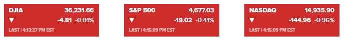 纳斯达克综合指数收盘下跌0.96%,收于14,935.90点,延续了本周的跌势。标准普尔500指数下跌0.41%,至4,677.03点。道琼斯指数下跌4.81点或0.01%,收于36231.66点。