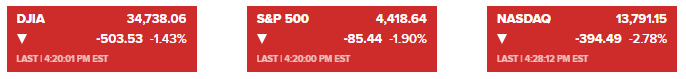 以科技股为主的纳斯达克综合指数收盘下跌2.78%,至13791.15点;标普500指数下跌1.90%,至4418.64点;道琼斯指数下跌503.53点或1.43%,至34738.06点。