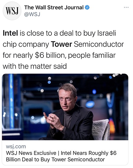 据《华尔街日报》2月14日报道,英特尔公司即将达成一项协议,以接近60亿美元的价格收购以色列芯片公司高塔半导体。
