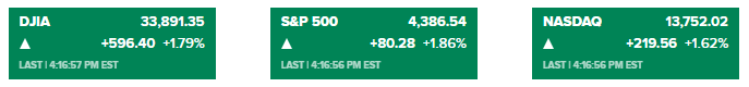 道琼斯指数上涨596.40点或1.79%,收报33891.35点;标准普尔500指数上涨1.86%,至4386.54点;以科技股为主的纳斯达克综合指数上涨1.62%,至13752.02点。这波涨势有效扭转了周二的跌幅。