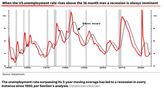 这一信号是最近美国失业率的上升。根据最新就业报告,11月失业率攀升至4.2%,超过了其36个月移动平均值。法国兴业银行的分析指出,自1950年以来,每当失业率超过其36个月移动平均值,美国经济随后都陷入衰退。