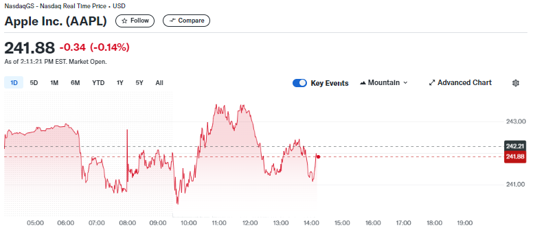周三(1月8日),截至发稿,苹果股价下跌0.14%,报241.88美元。