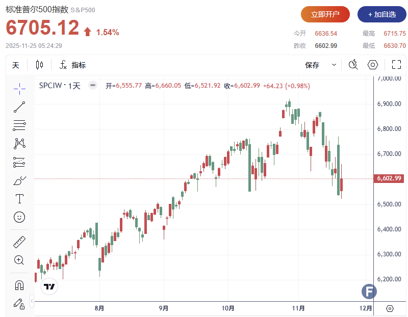 标普500指数上涨 1.54%,收于 6,705.12 点;纳斯达克综合指数跳涨 2.69% 至 22,872.01 点,创下自5月12日以来的最佳单日表现;当时该指数曾上涨 4.35%。道琼斯工业平均指数上涨 202.86 点(0.43%),收于 46,448.27 点。