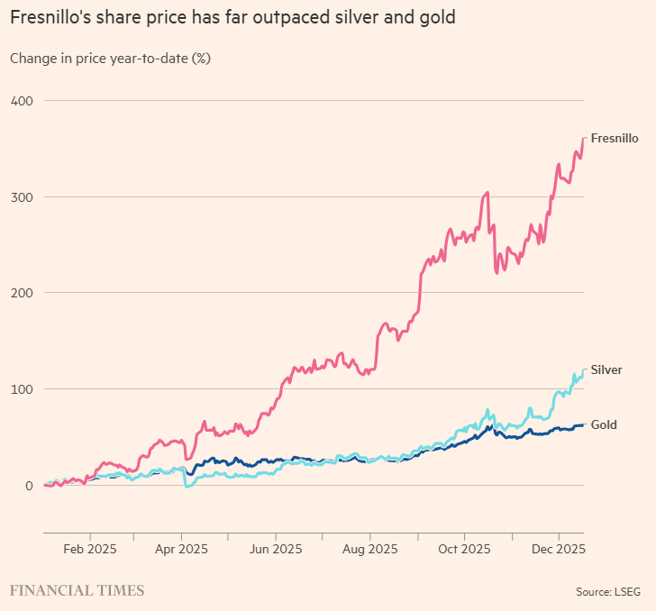 总部位于墨西哥城的白银生产商 Fresnillo,正处于这轮行情的浪潮之巅。该公司股价在2025年上涨近五倍,成为伦敦富时100指数中表现最好的成分股。