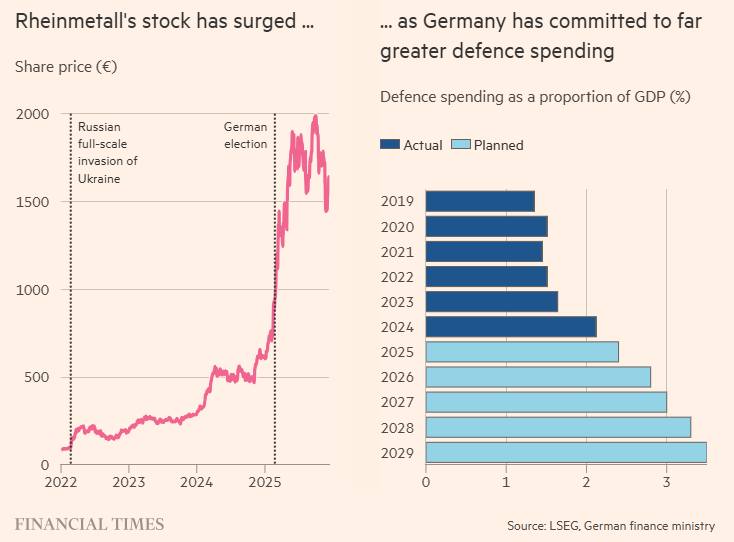 这家总部位于杜塞尔多夫的坦克和弹药制造商,自俄罗斯全面入侵乌克兰以来股价持续走高,仅2025年就上涨151%。