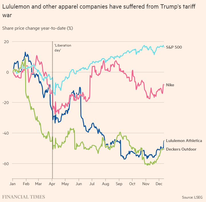 高端运动服饰品牌 Lululemon 股价今年下跌近一半,尽管12月中旬因CEO即将离任的消息出现反弹。特朗普关税政策、美国消费者成本压力上升、产品失误以及竞争加剧,共同拖累了公司表现。