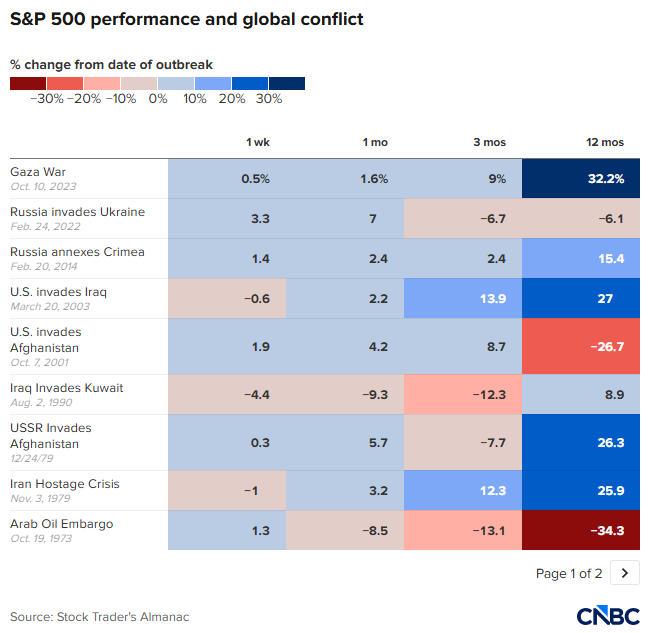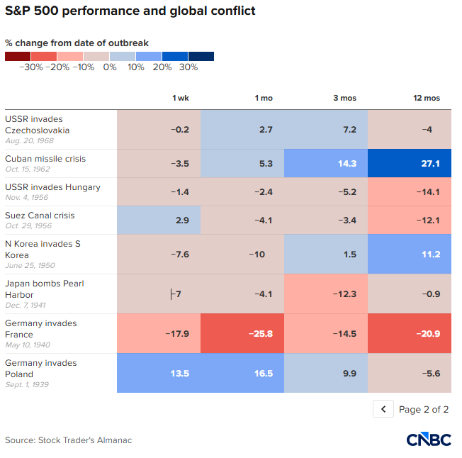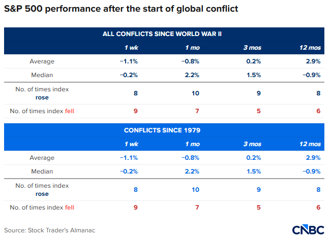 《Stock Trader’s Almanac》(股票交易者年鉴)对1939年以来17次地缘政治重大冲击的统计显示,标普500指数在“初始冲击”后的一周平均跌幅为1.09%。