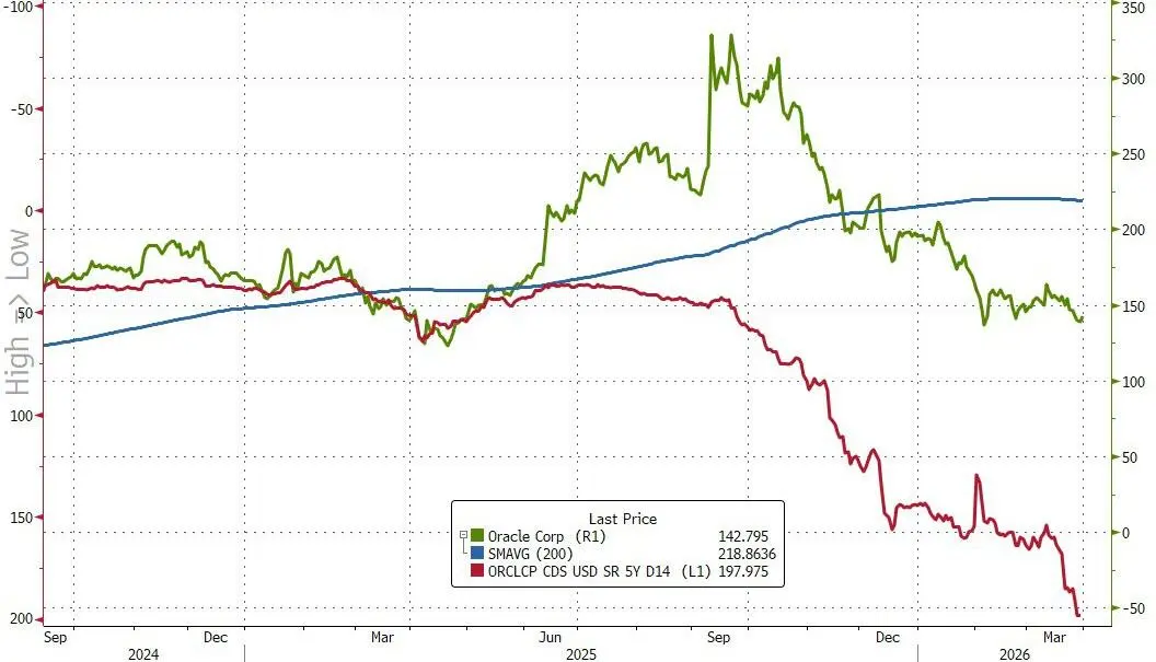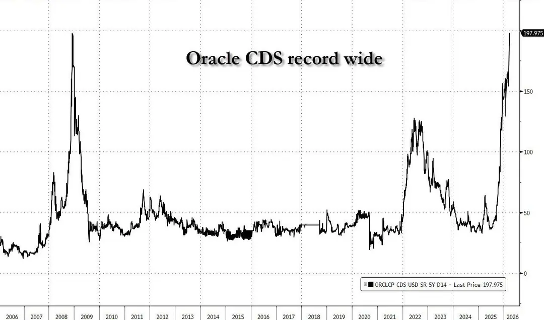 FX168财经报社(北美)讯 在高举高打押注AI基础设施扩张之后,甲骨文(Oracle)正面临越来越大的市场质疑。继今年早些时候宣布通过股权与债券融资筹集500亿美元后,公司股价持续下挫,5年期信用违约掉期(CDS)利差更升至纪录最宽水平,达到仅在全球金融危机期间出现过的危险区间。如今,随着甲骨文启动新一轮大规模裁员,市场愈发担心,这家科技巨头正为其激进扩张与高资本开支战略付出代价。