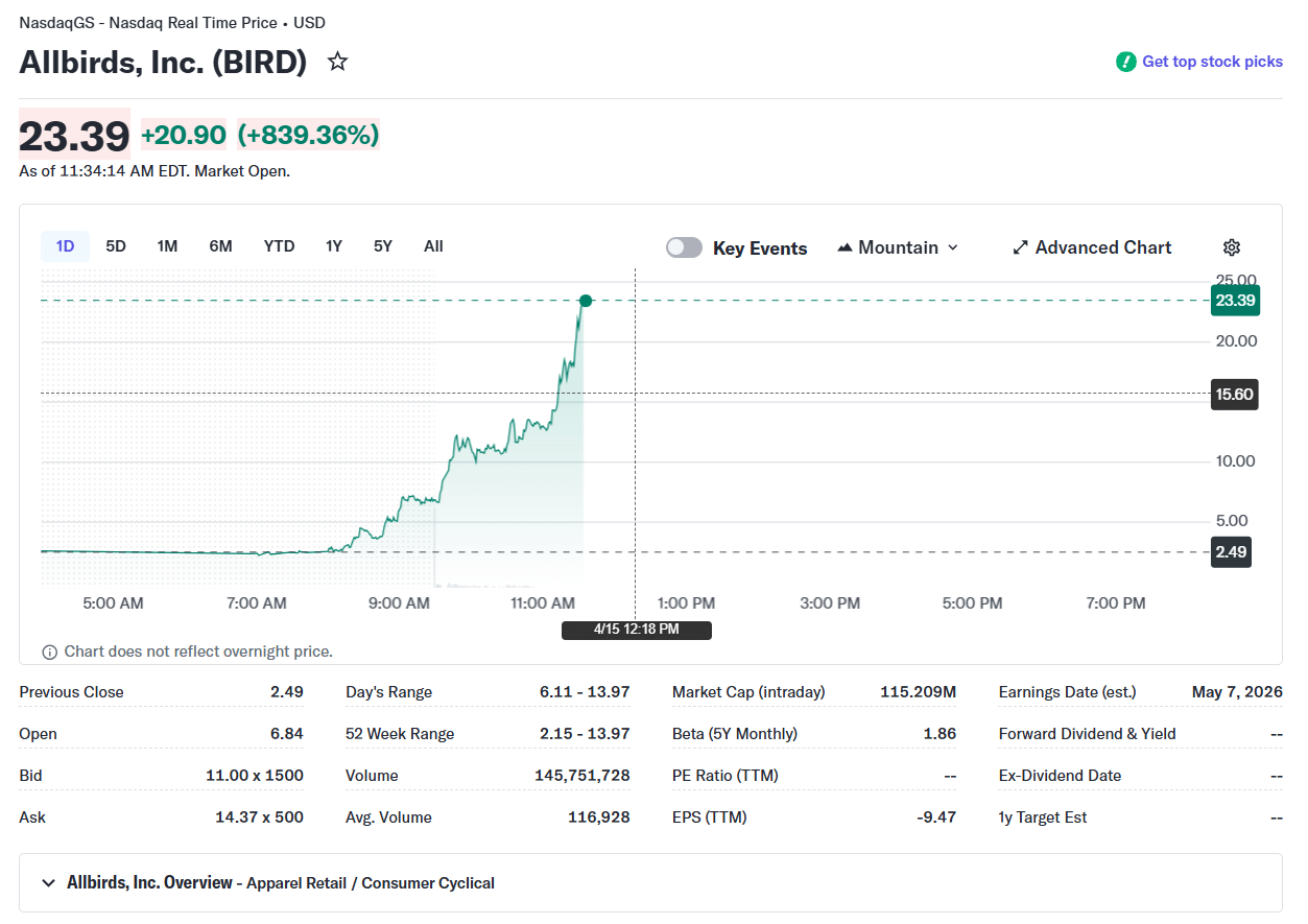 受这一消息刺激,Allbirds股价周三(4月15日)一度暴涨876%,升至24.31美元,而其周二收盘价仅为2.49美元,市场反应极为剧烈。
