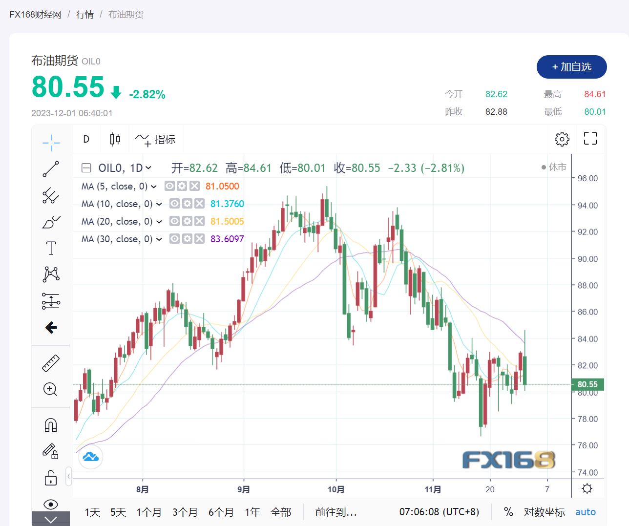 截至发稿,现报80.55美元/桶,跌幅2.82%。
