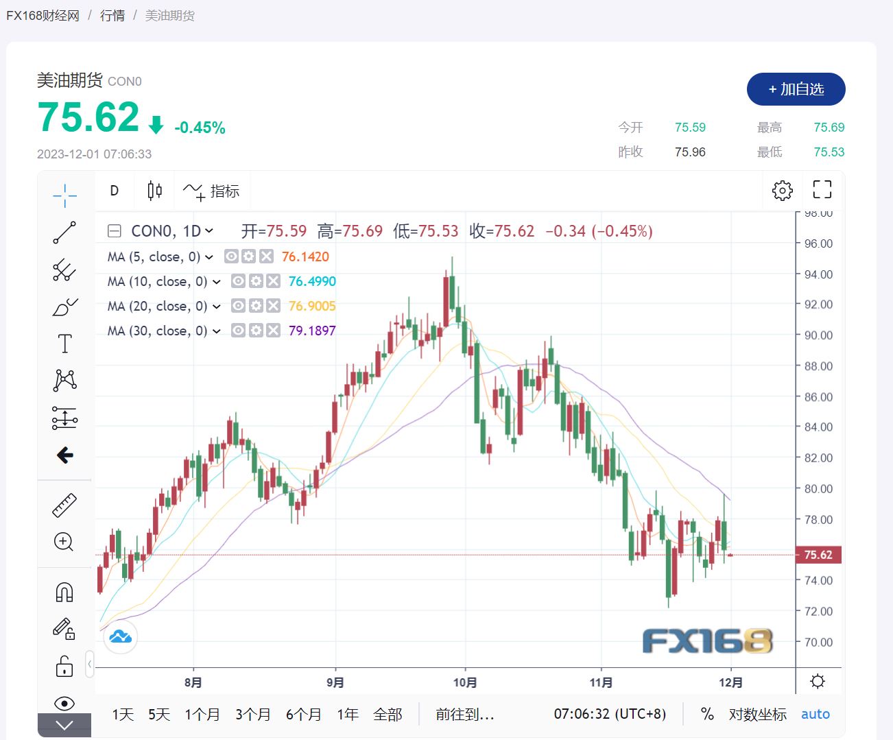 截至发稿,现报75.62美元/桶,跌幅0.45%。