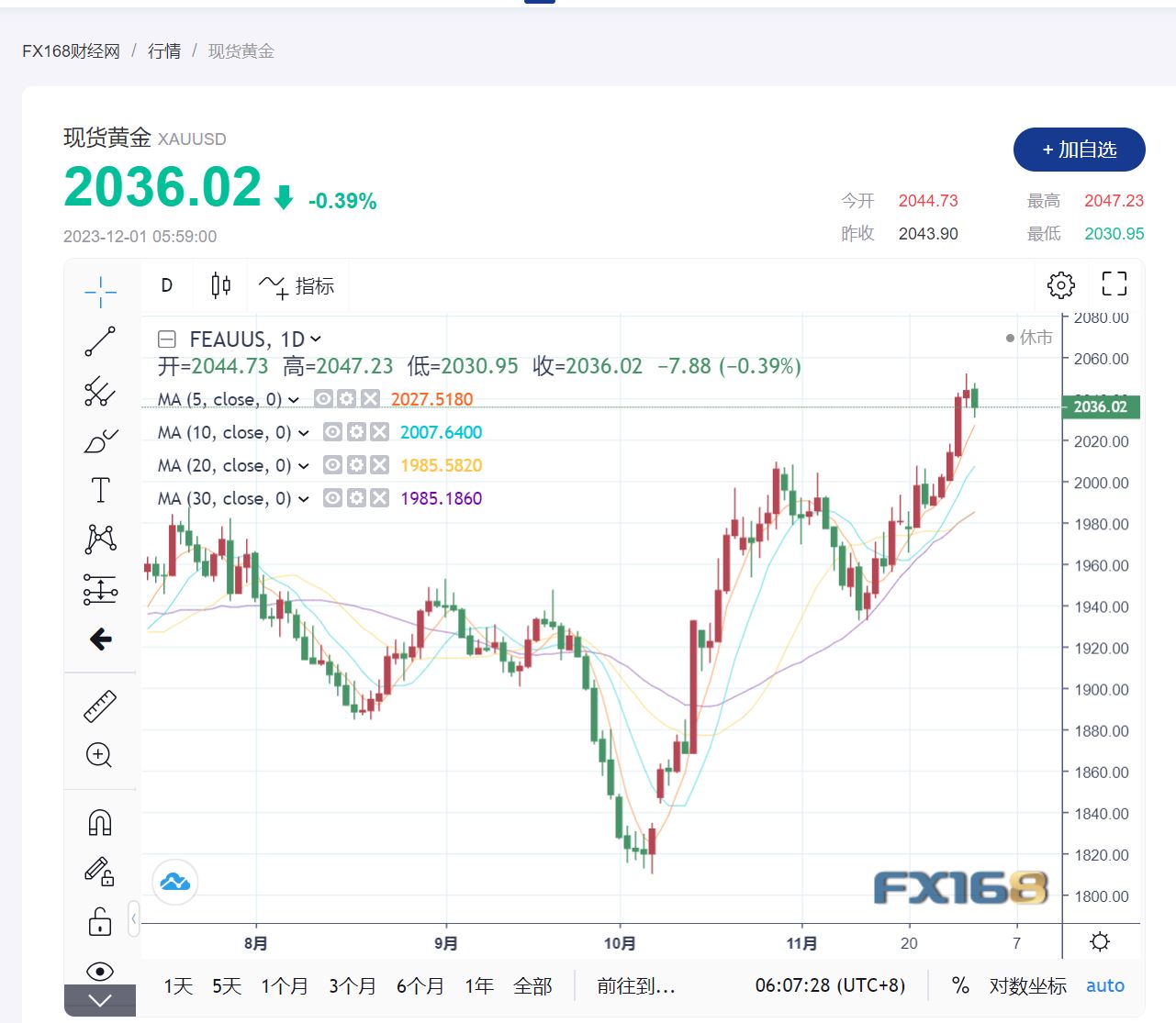 (现货黄金走势图,来源:FX168)