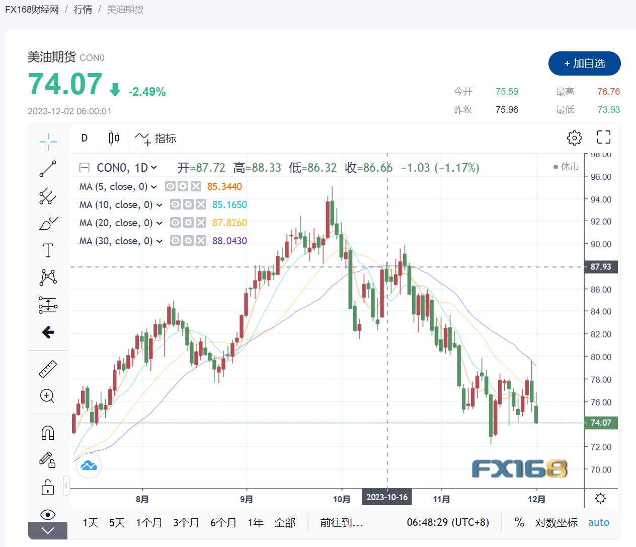 美国西德克萨斯中质原油期货(WTI)下跌1.89美元/桶,跌幅2.49%,收报74.07美元/桶。