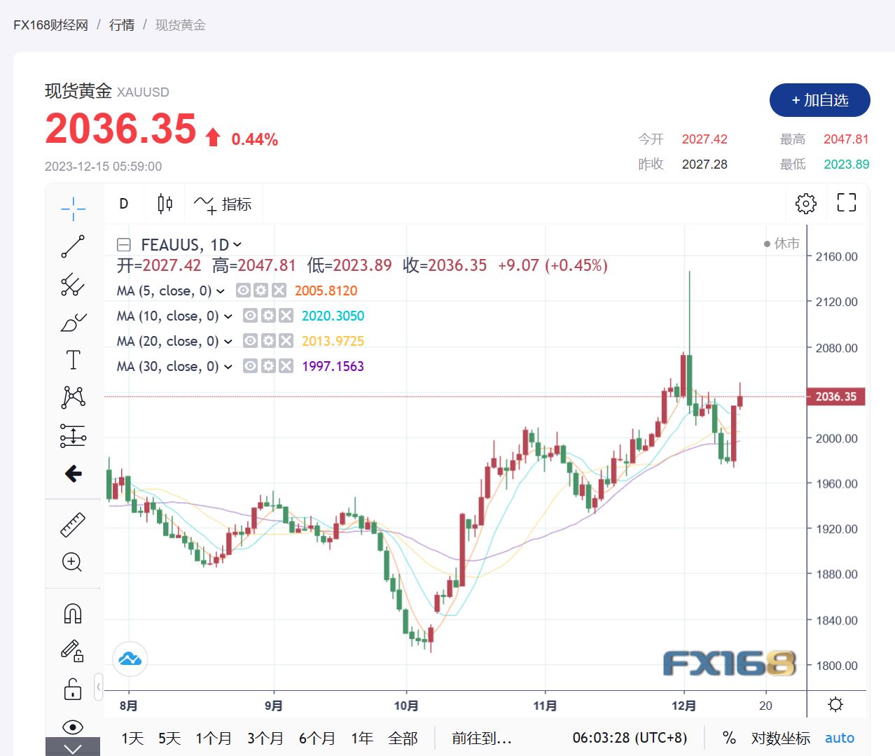 24K99讯 周四(12月14日),在美联储对美国货币政策发表出人意料的鸽派言论后,黄金和白银价格在周四大幅上涨。COMEX 2月黄金期货结算价收涨2.38%,报2044.9美元/盎司。现货黄金延续昨日涨势,收涨0.44%,收报2036.35美元/盎司。