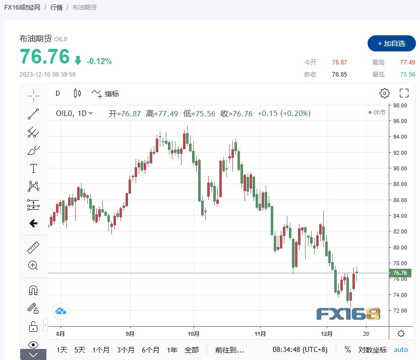 布伦特原油期货下跌0.06美元/桶,跌幅0.08%,至每桶76.55美元。截至发稿,现报76.76美元/桶,跌幅0.12%。