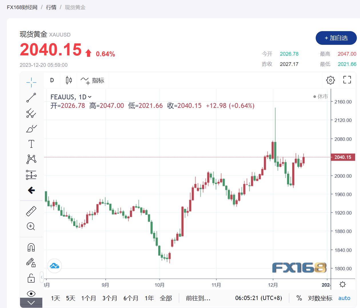 现货黄金收涨0.64%,收报2040.15美元/盎司。