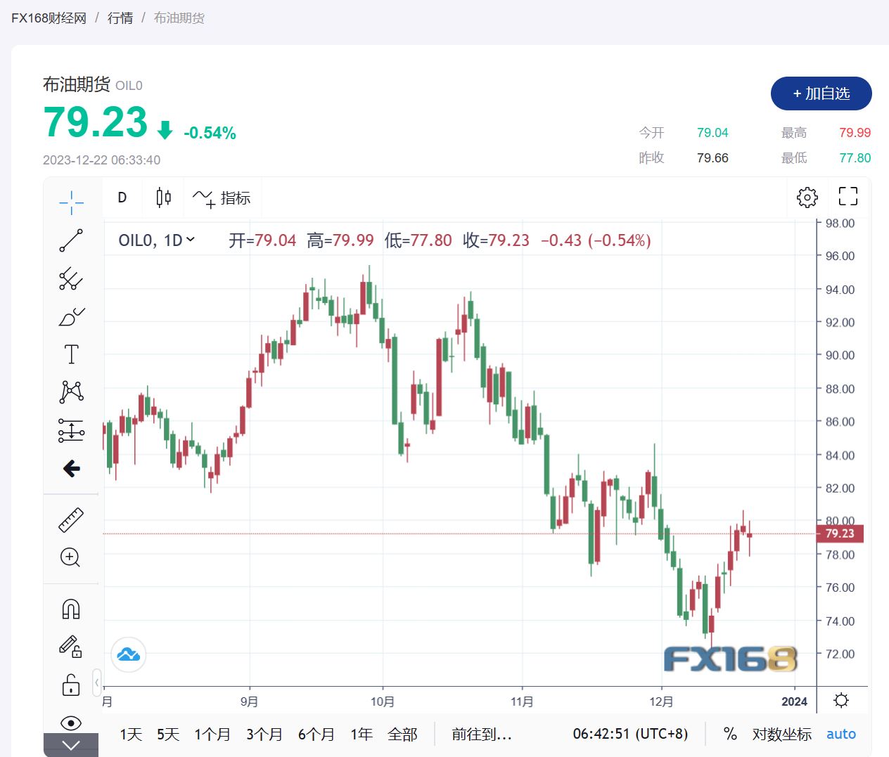 布伦特原油期货收跌 0.31美元/桶,收报79.39美元/桶。截至发稿,现报79.23美元/桶,跌幅0.54%。