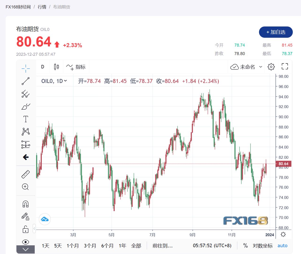 布伦特原油期货2024年2月合约结算价报81.07美元/桶,涨幅2.53%或2美元/桶,盘中一度上涨 3.4%。截至发稿,现报80.64美元/桶,涨幅2.33%。