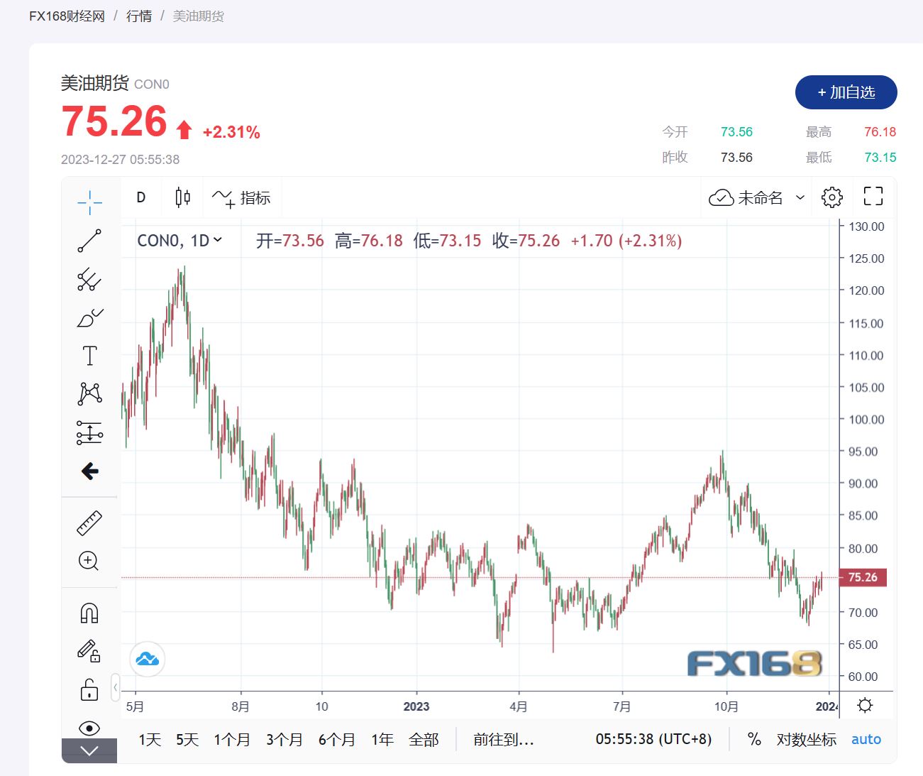 WTI原油期货2024年2月合约结算价报75.57美元/桶,涨幅2.73%或2.01美元/桶。截至发稿,现报75.26美元/ 桶,涨幅2.31%。