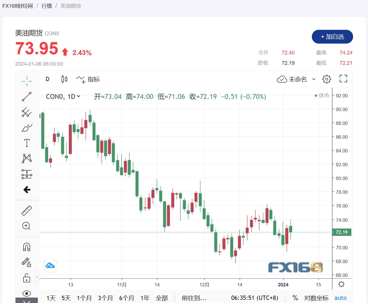 WTI 2月原油期货收涨1.62美元/桶,涨幅2.24%,收报73.81美元/桶,本周累计上涨超3.01%。截至发稿, 现报73.96美元/桶,涨幅2.43%。