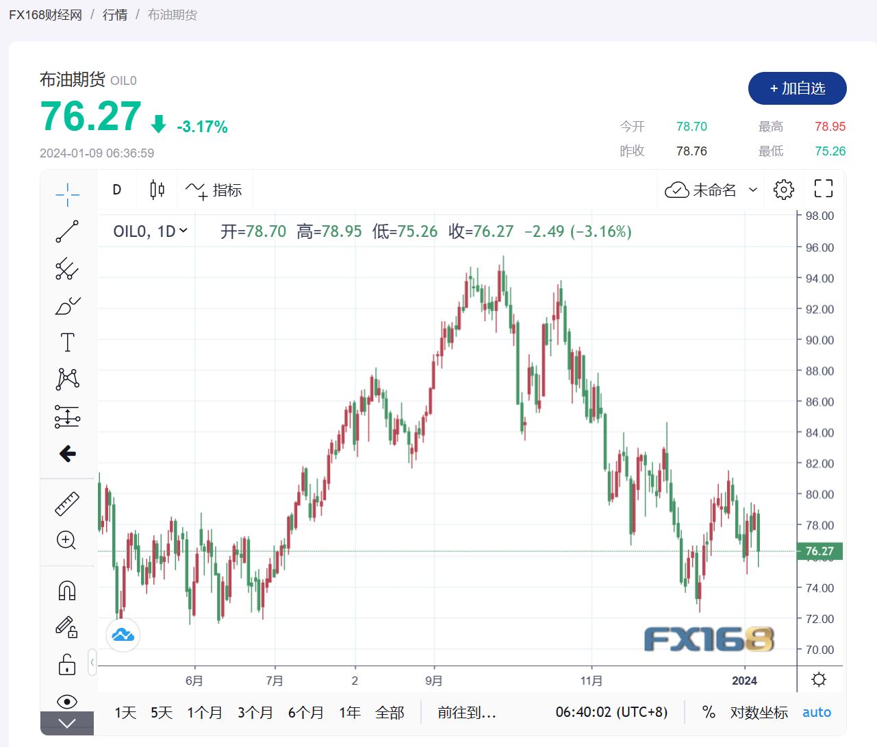 布伦特原油期货2024年3月合约结算价报76.12美元/桶,跌幅3.35%或2.64美元/桶。截至发稿,现报76.27美元/桶,跌幅3.17%。