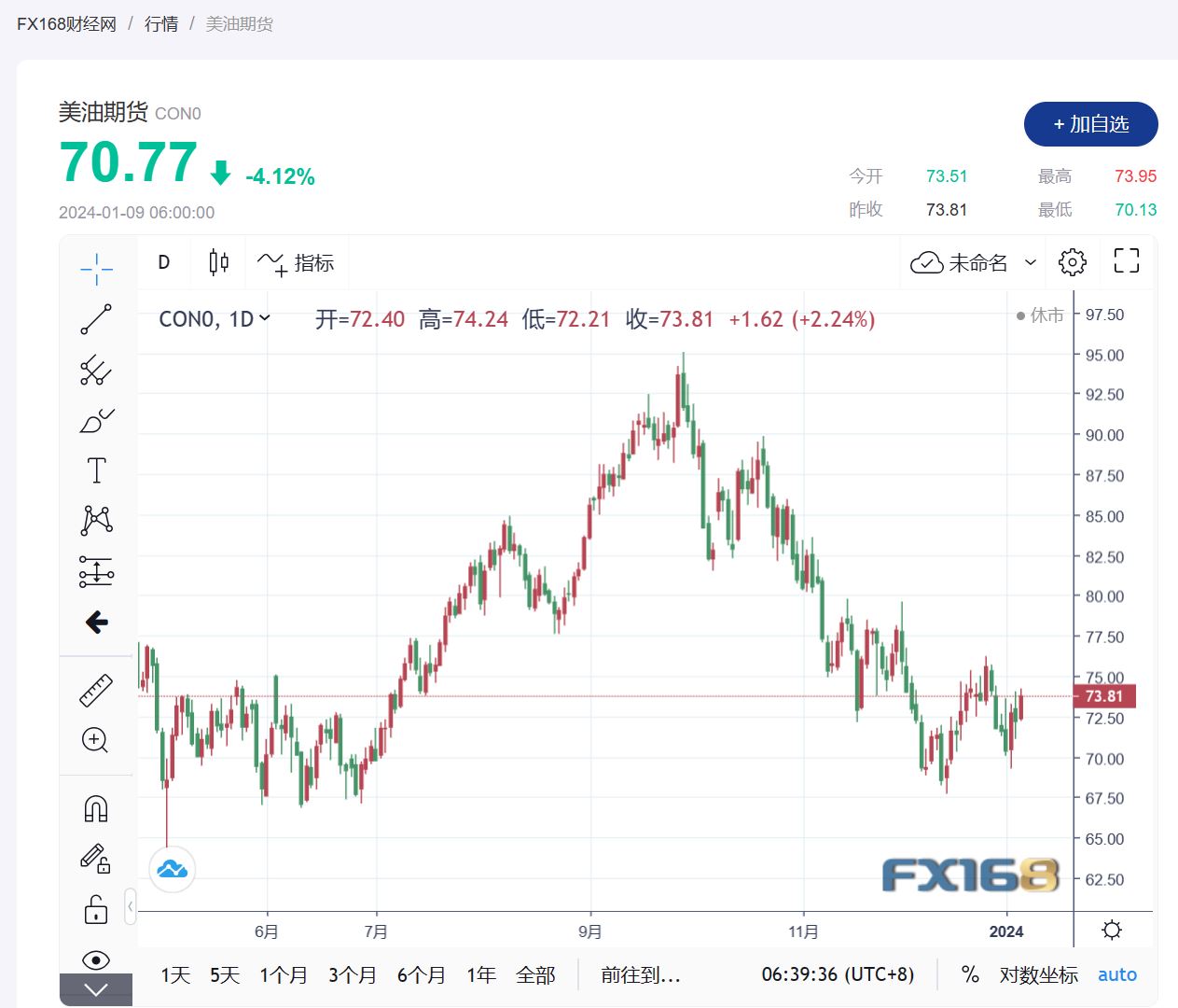 WTI原油期货2024年2月合约结算价收报70.77美元/桶,跌幅4.12%或3.04美元/桶。