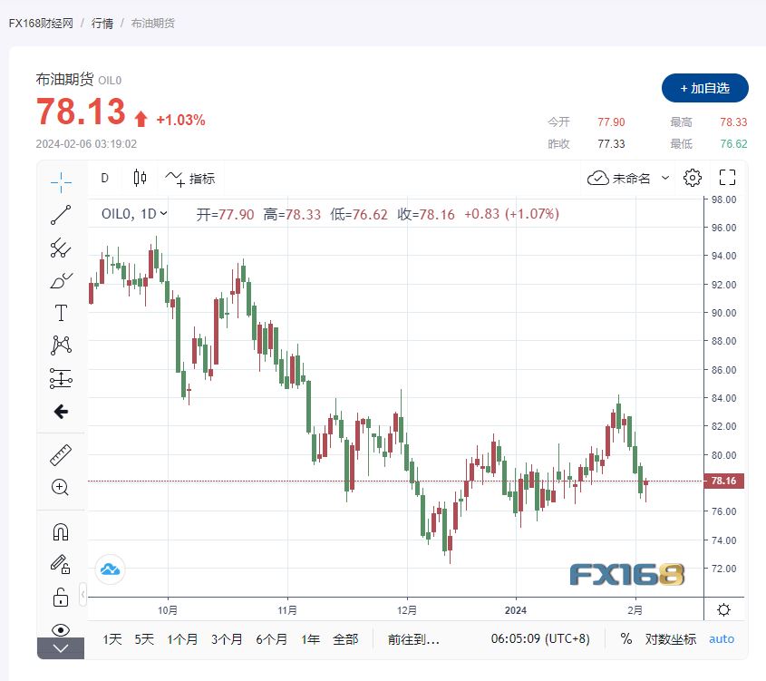 布伦特原油期货收涨0.9%,或0.66美元/桶,收报77.99美元/桶。截至发稿,现报78.13美元/桶,涨幅1.03%。