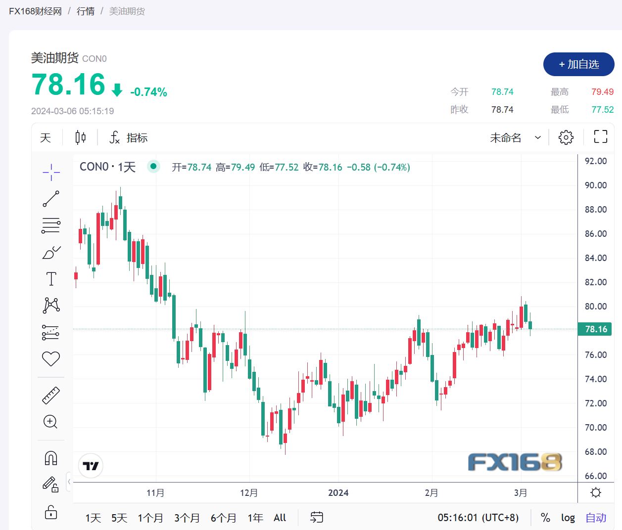WTI 4月原油期货收跌0.59美元,跌幅接近0.75%,报78.15美元/桶。截至发稿,现报78.16美元/桶,跌幅0.74%。